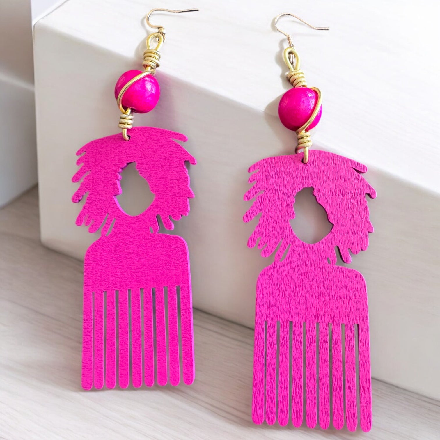 Celebrate your culture and heritage with our vibrant pink wooden earrings, designed in the shape of an afro pick. Perfect for Summerfest, Juneteenth, family gatherings, and festivals. Pair them with our Dare To Be You Jewelry Turban Headwraps for a bold and stylish look.
