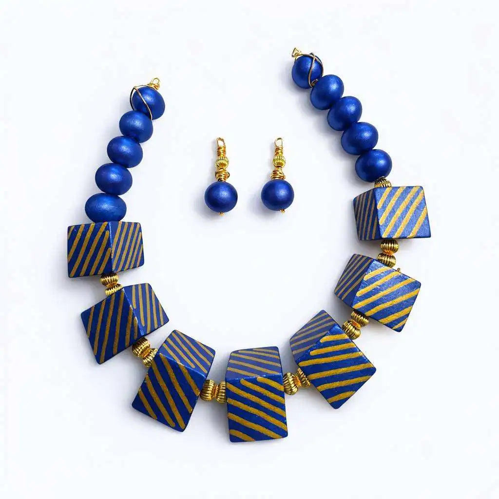 Handcrafted Afrocentric chunky wood statement necklace set featuring 1-inch hand-painted block wood beads in royal indigo and gold. Designed with an 18-inch toggle clasp and matching earrings for confident women who refuse to blend in.