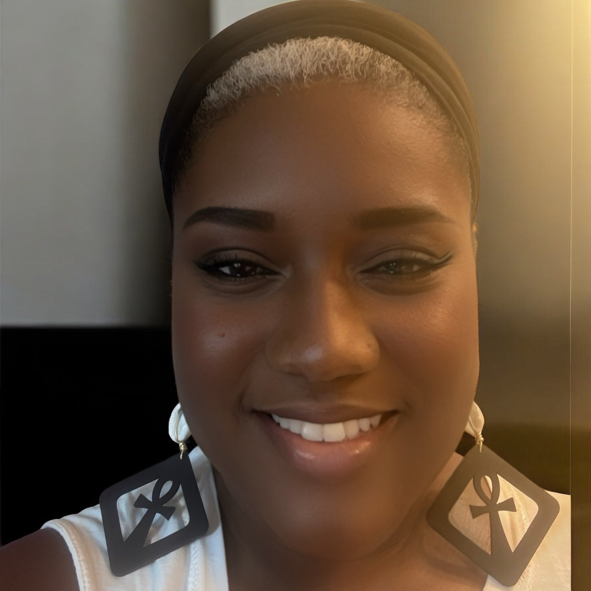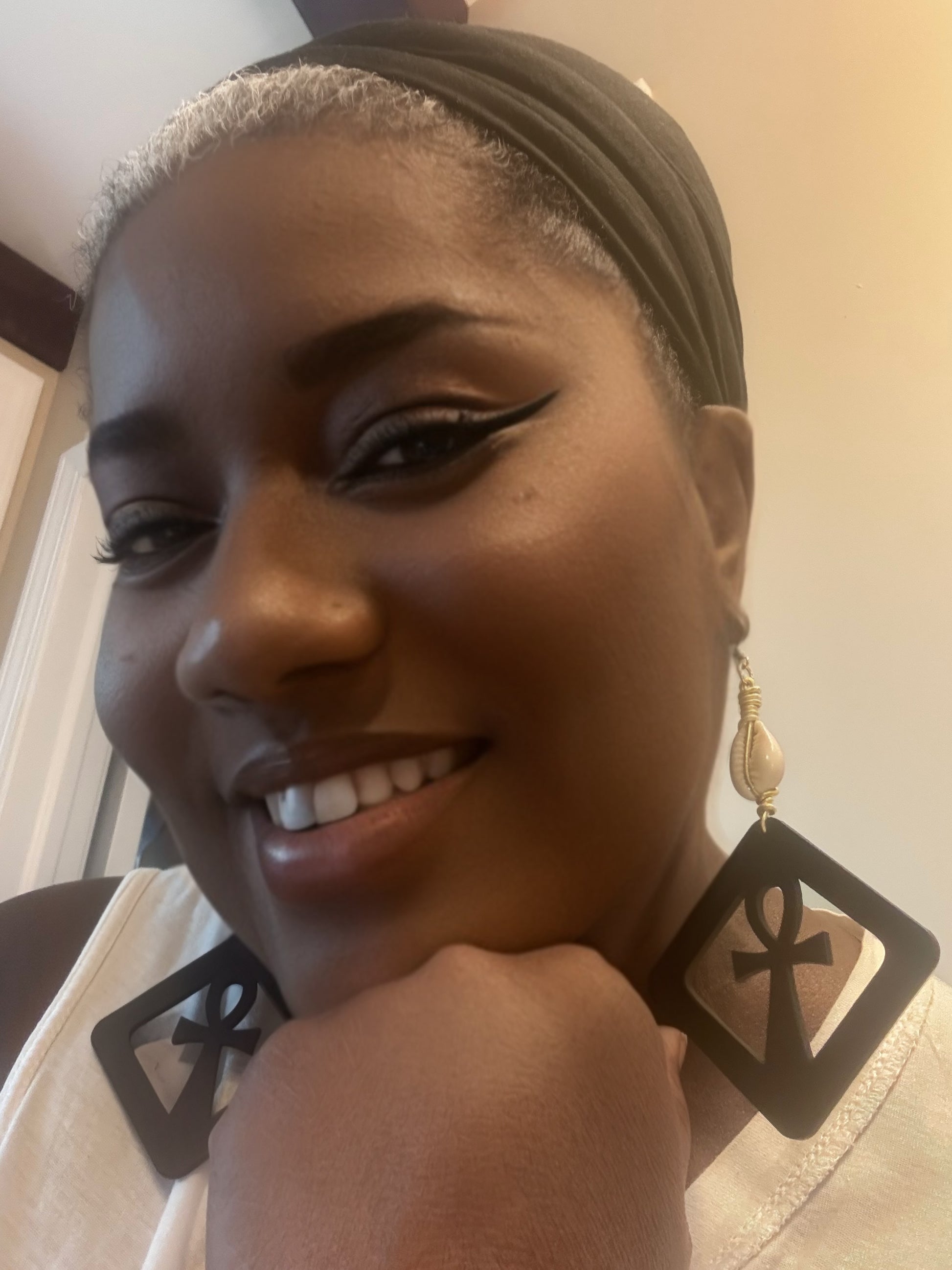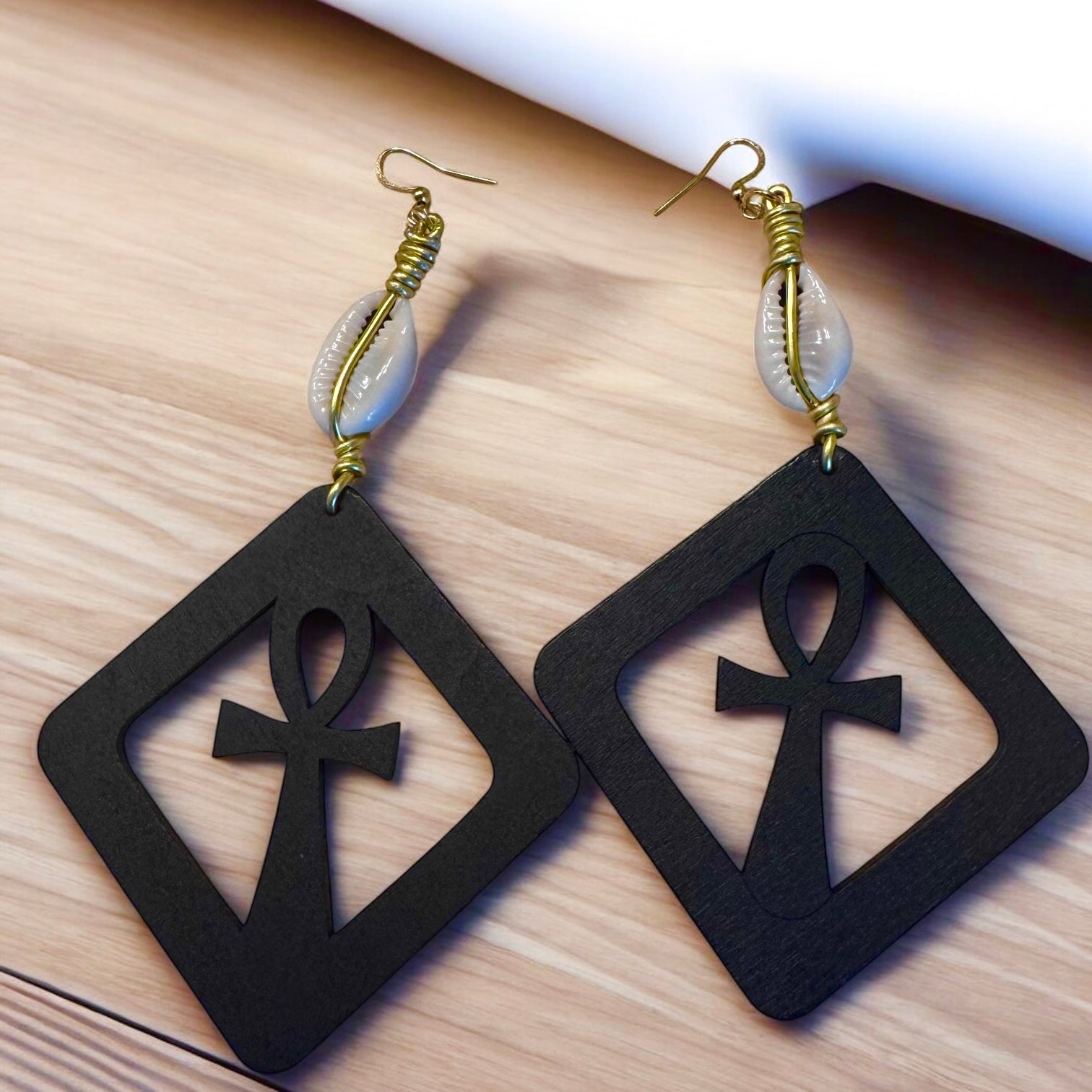 Add a unique touch to your outfit with our Ankh Cross Earrings. These wooden earrings feature a hand-made goldwire wrap and a cowrie shell, making them a perfect addition to your Dare To Be You Jewelry Turban Head Wrap. Embrace your individuality with our Ankh Cross Earrings.