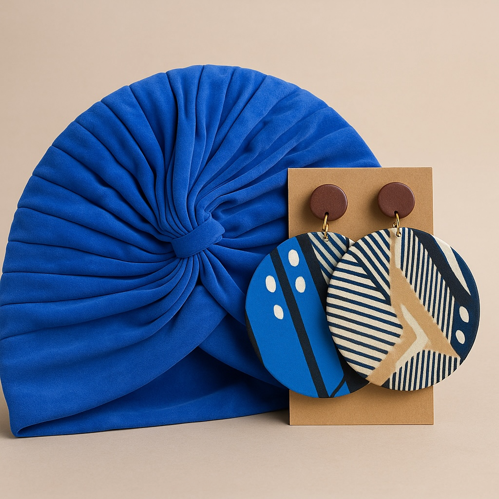 Unleash your culture and make a statement with our Beautiful Blue Turban Headwrap and Earring Set. This vibrant blue turban is one size fits all, making it a convenient slip-on-and-go accessory. Complete your look with our handmade wood earrings, featuring a beautiful blue print. Time to celebrate your culture in style!