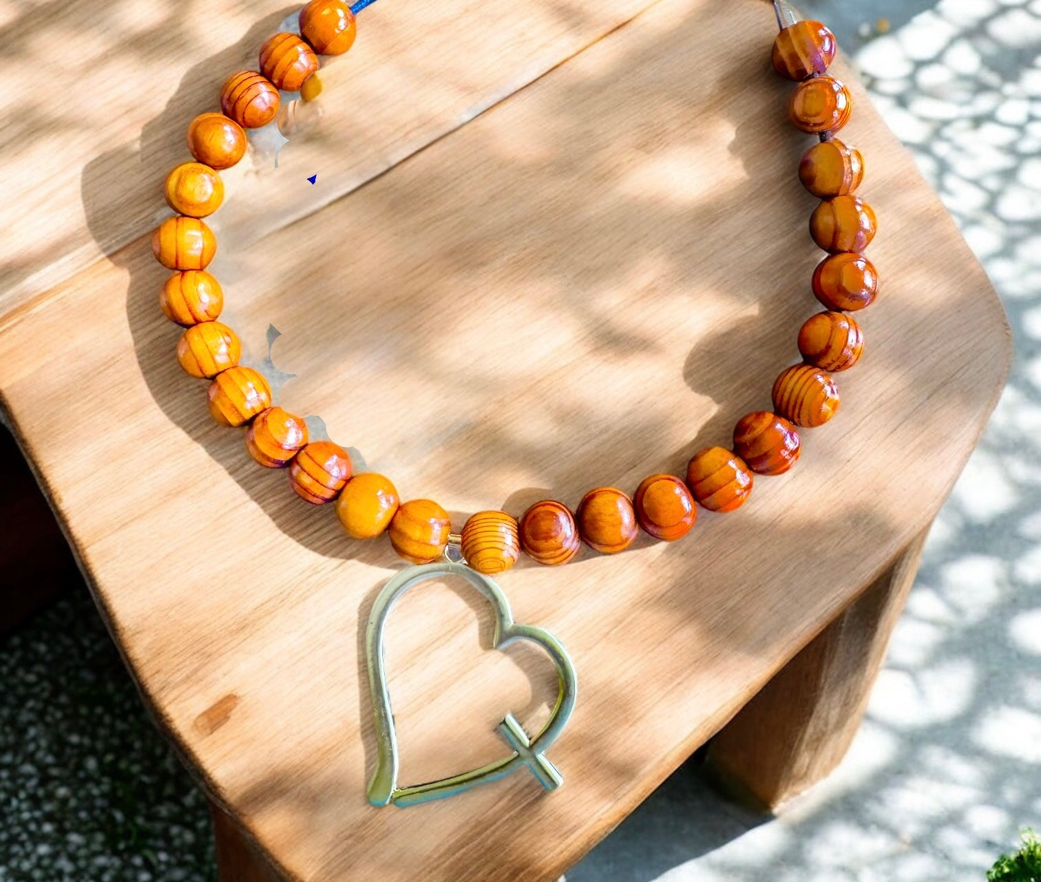 This stunning Brown Bead Heart Cross Pendant Necklace combines rich, earthy tones with a touch of elegance. The brown wood beads add a natural, organic feel, while the gold cross pendant adds a sophisticated touch. Perfect for those who want to express their unique style with a statement piece. Handmade to perfection with Dare To Be You Jewelry.