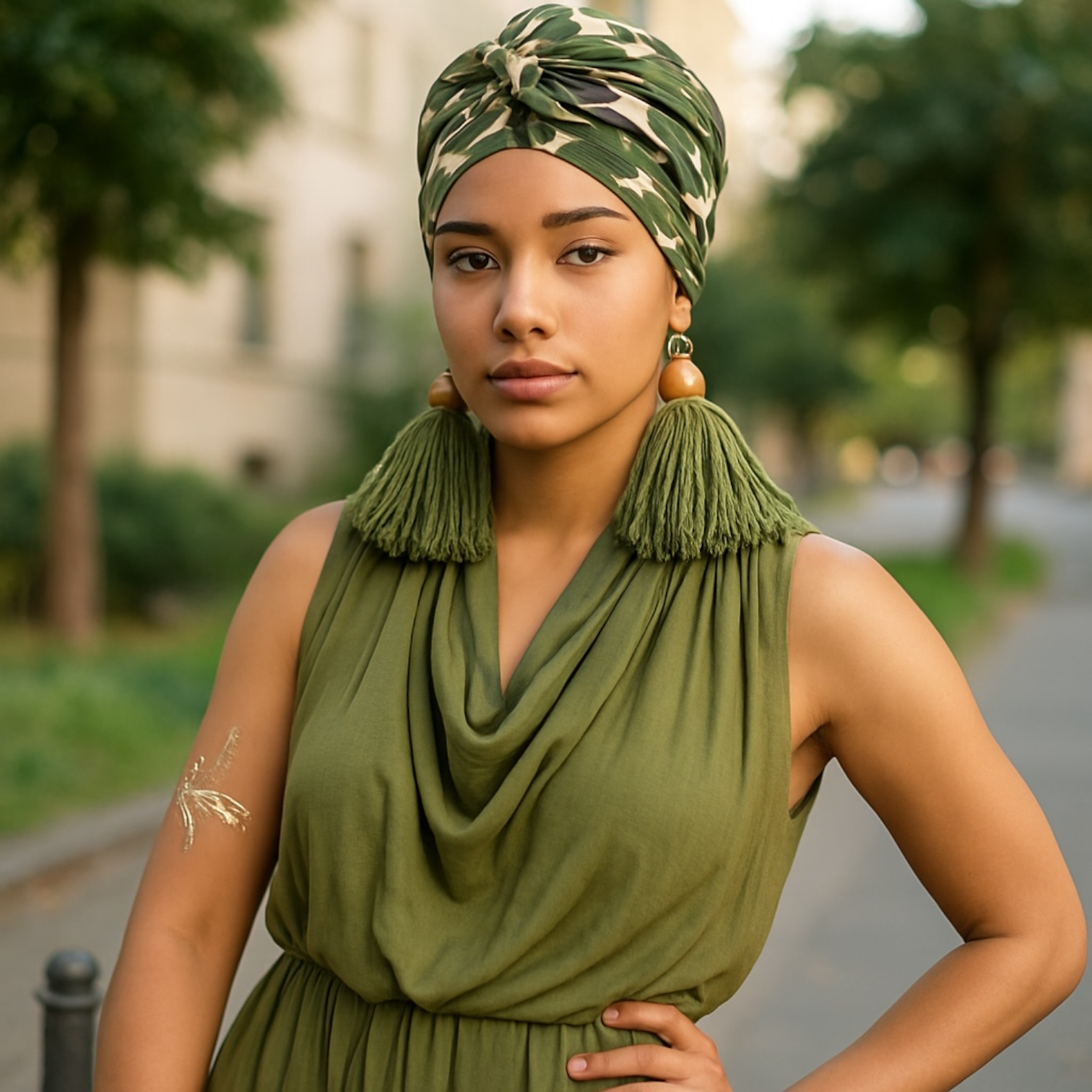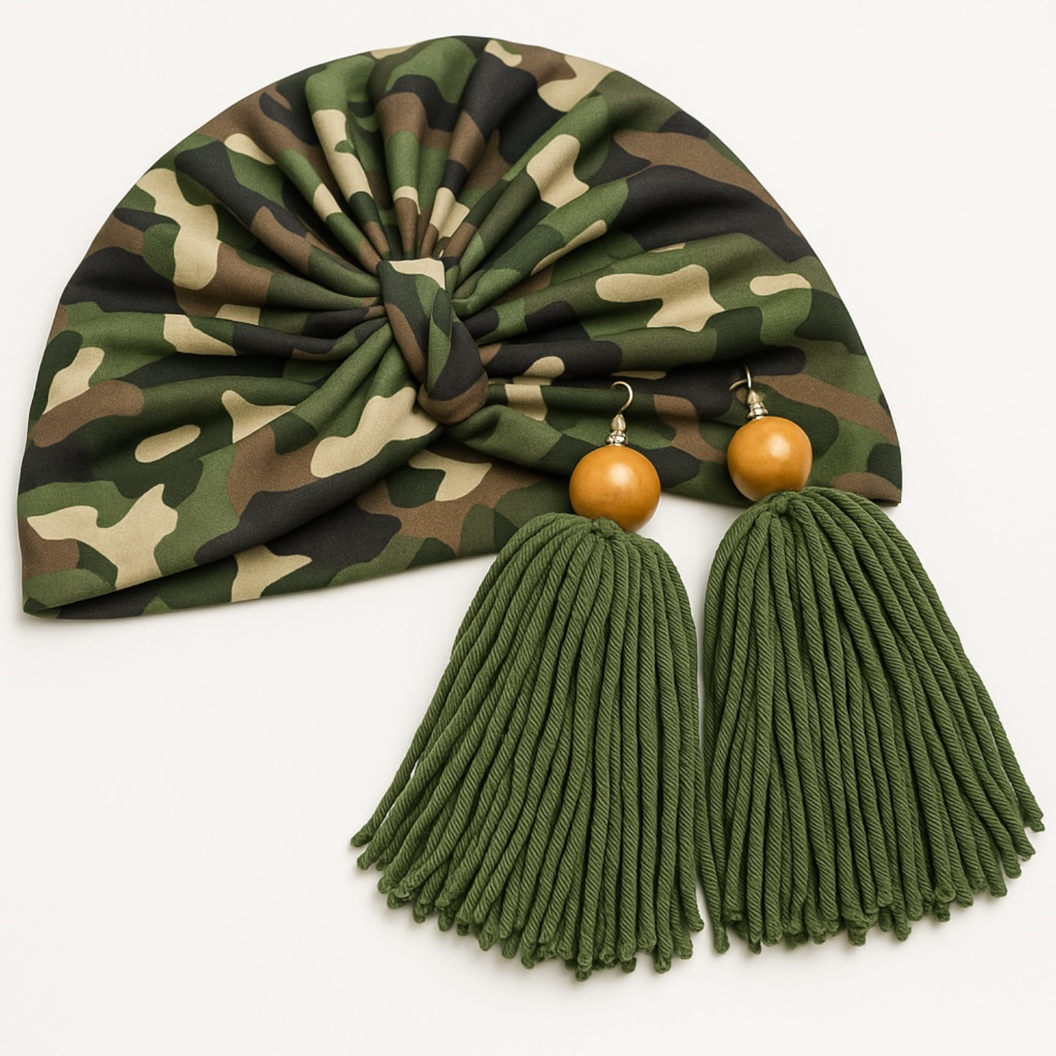 Elevate your summer style with our Camouflage Turban Headwrap and Earring Set. Made from a breathable and lightweight fabric, this one-size-fits-all turban is easy to slip on and perfect for any occasion. Complete your look with stunning green yarn tassel earrings, wrapped in gold yarn. Upgrade your wardrobe for only $20.