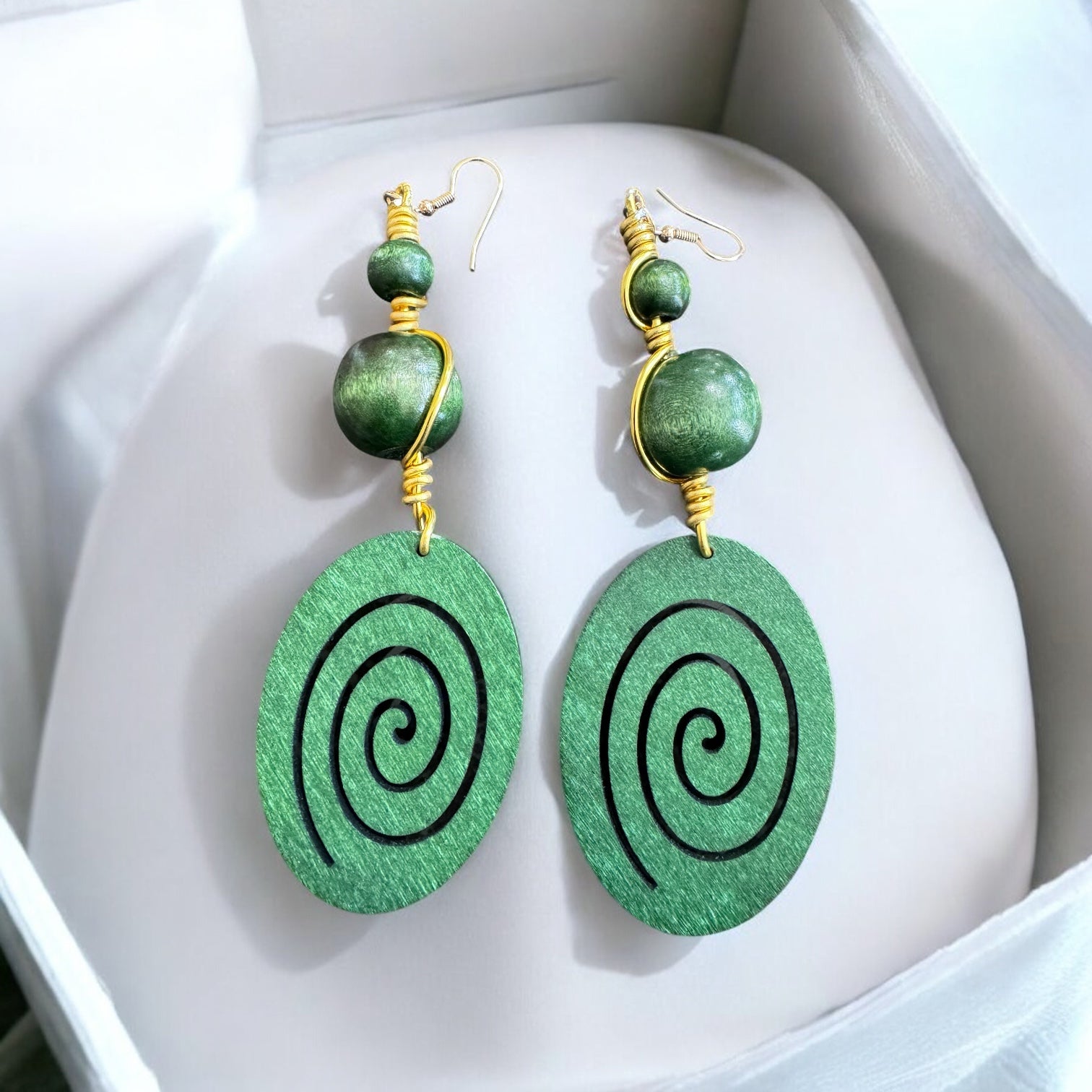 Enhance your fashion with our Green Wood Round Spiral Earrings! Handcrafted and adorned with green beads and gold wire, these earrings bring a touch of the natural world to your outfit. Match them with our turban headwraps for a flawless combination. These statement earrings feature a one-of-a-kind twist!