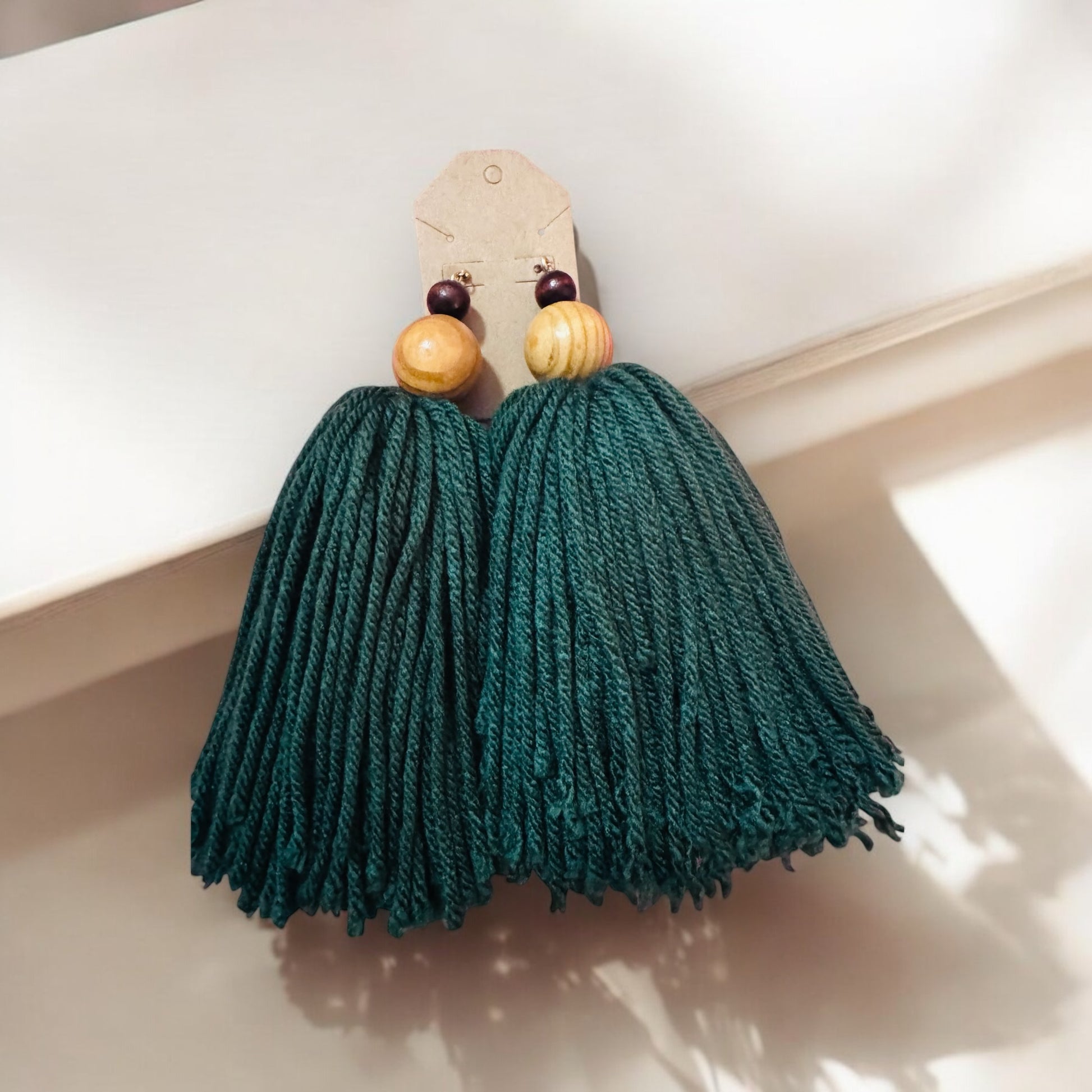 Add a bold statement to your look with these stunning handmade oversized green tassel earrings. Crafted with soft, premium yarn and accented with a charming wooden bead, these earrings are the perfect blend of earthy elegance and vibrant style. Measuring an eye-catching 6 inches in length, they’re designed to stand out, yet their lightweight construction—just 0.07 ounces—ensures all-day comfort.