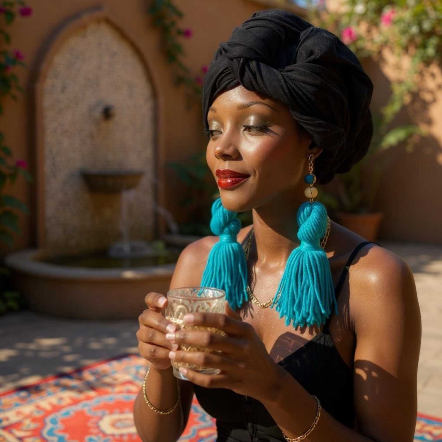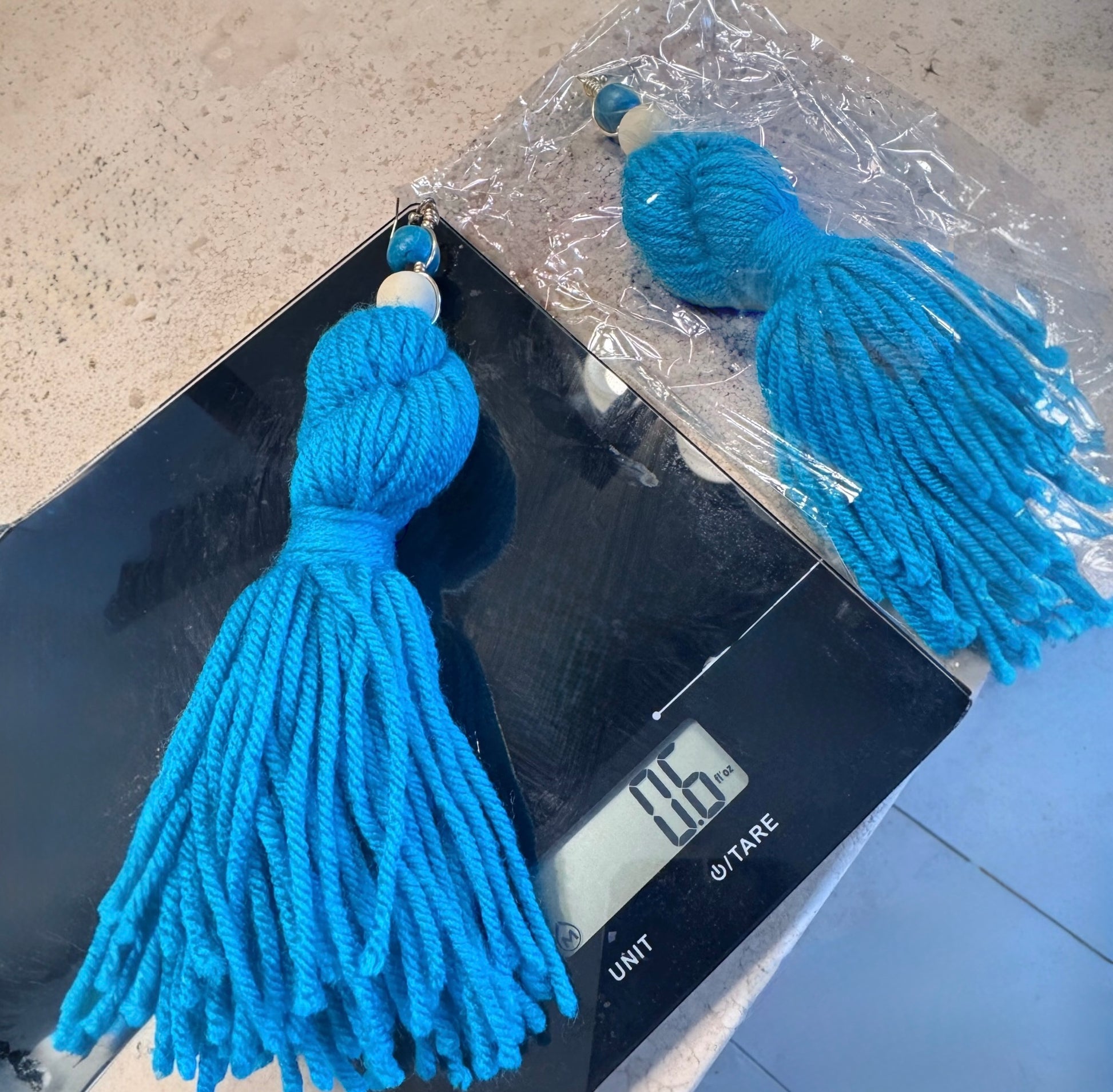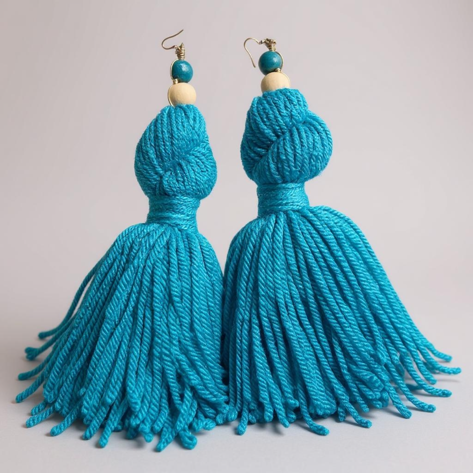 "Add a touch of elegance to your wardrobe with our handmade Turquoise Twist Yarn Earrings. These vibrant statement earrings feature a stunning 5 inch length and lightweight design, adorned with turquoise and beige wood beads. Dress up or down and feel like royalty with this bold and beautiful accessory. Purchase your pair today at an incredible price of $16."