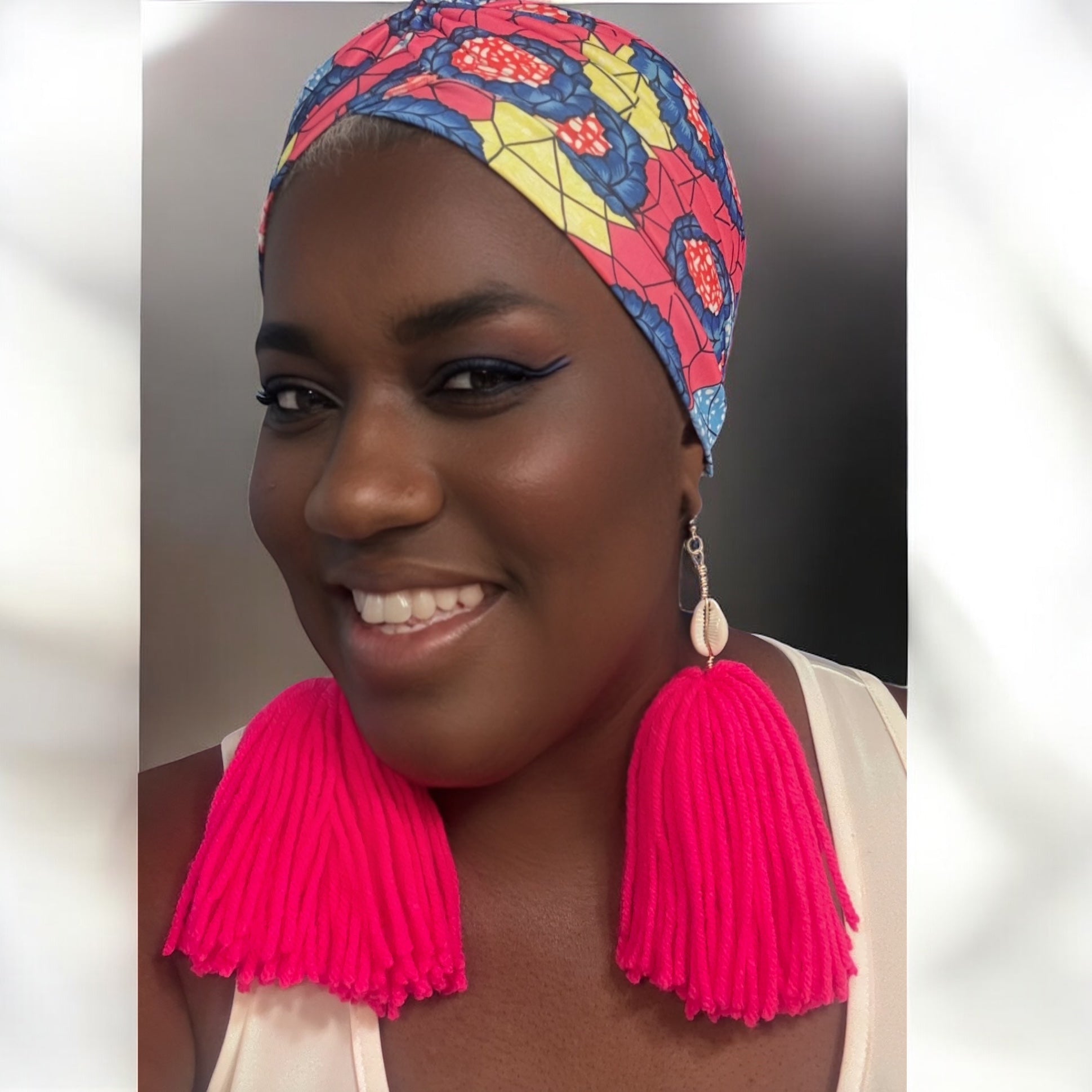 Achieve a stylish and effortless look with our Hot Pink Printed Turban Headwrap Earring Set. Made of breathable fabric, this beautiful printed turban is easy to slip on and go. The vibrant pink yarn earrings, featuring a cowrie shell wrapped in gold wire, add a touch of summer vibes. Perfect for summer concerts, vacations, family gatherings, and cookouts. Grab yours for only $20 now!