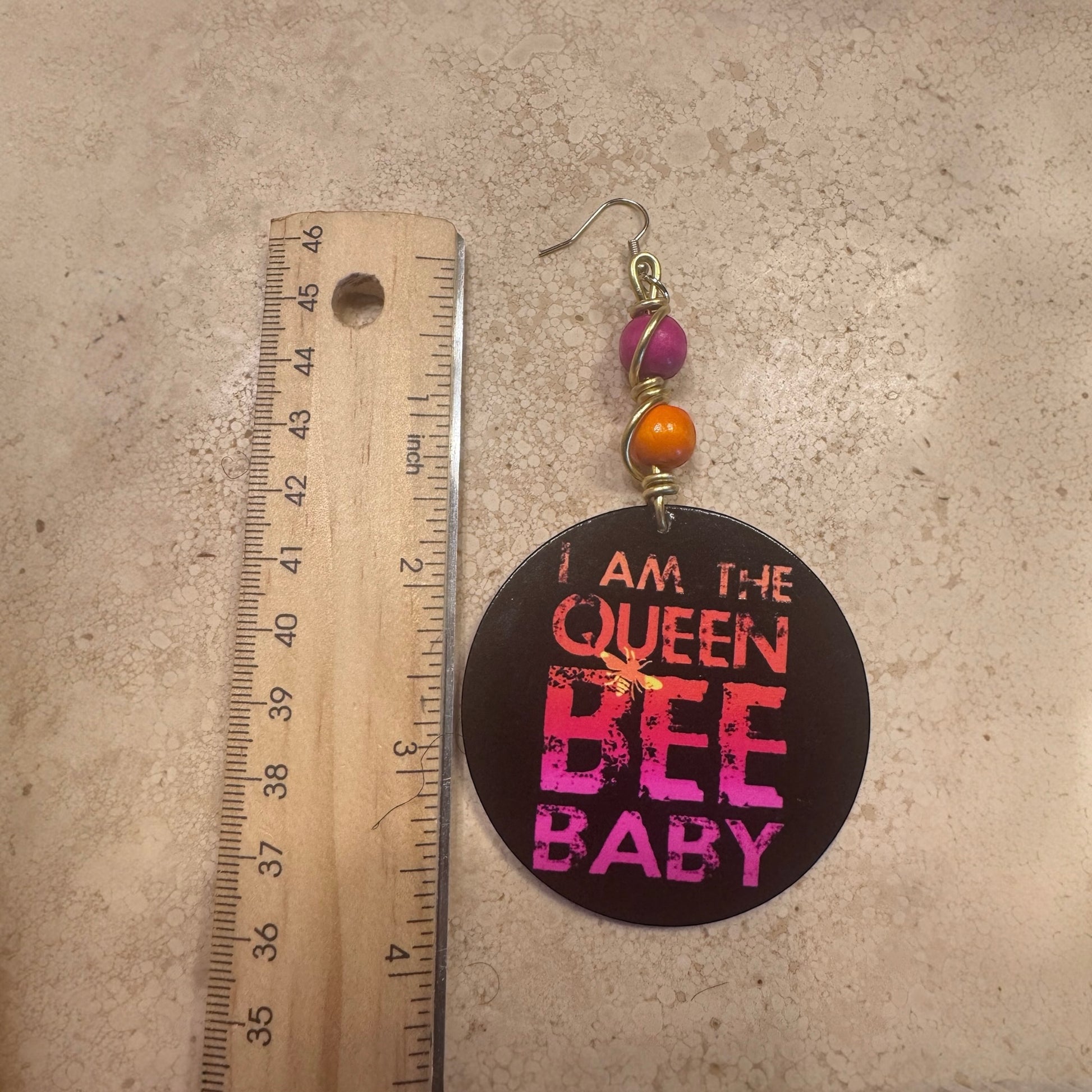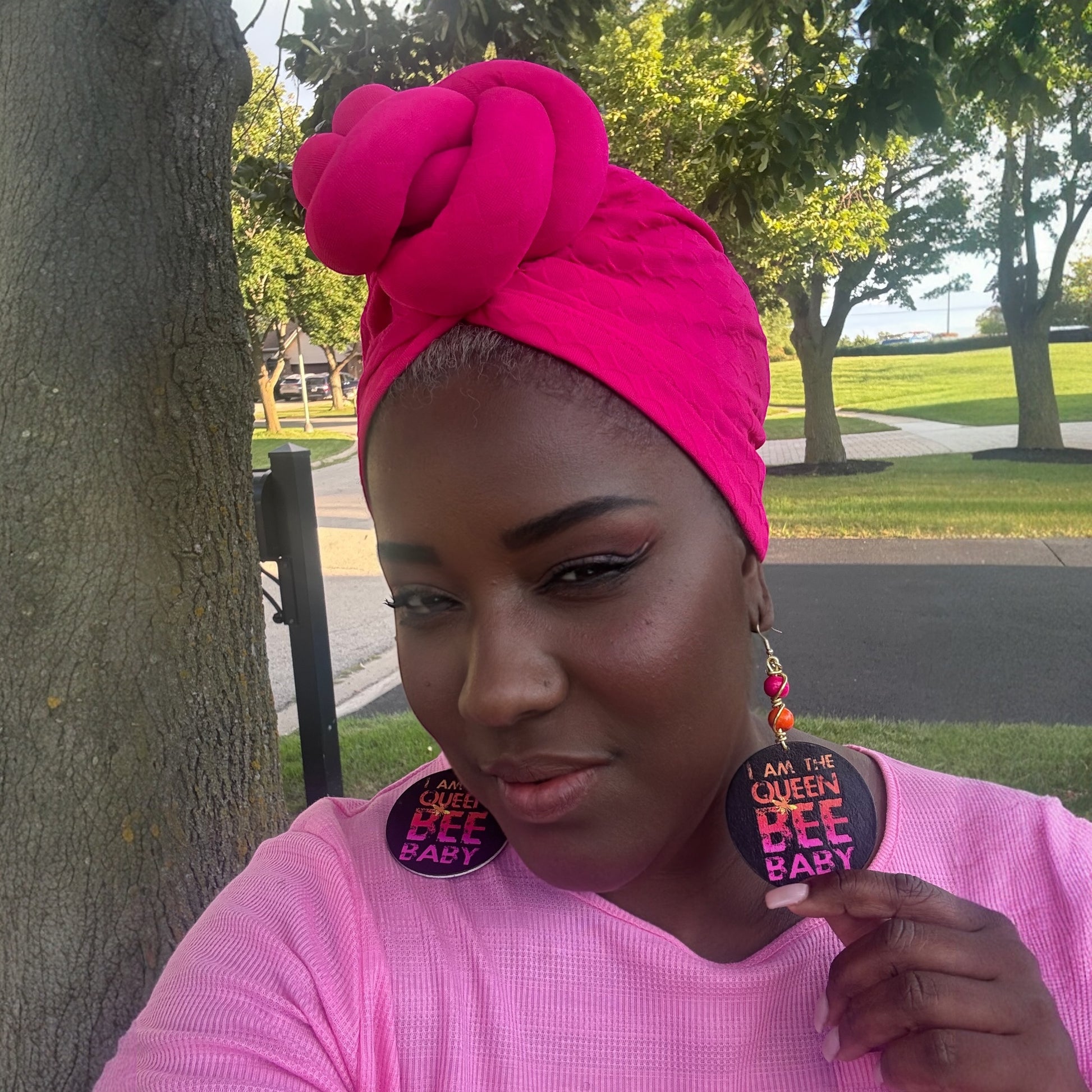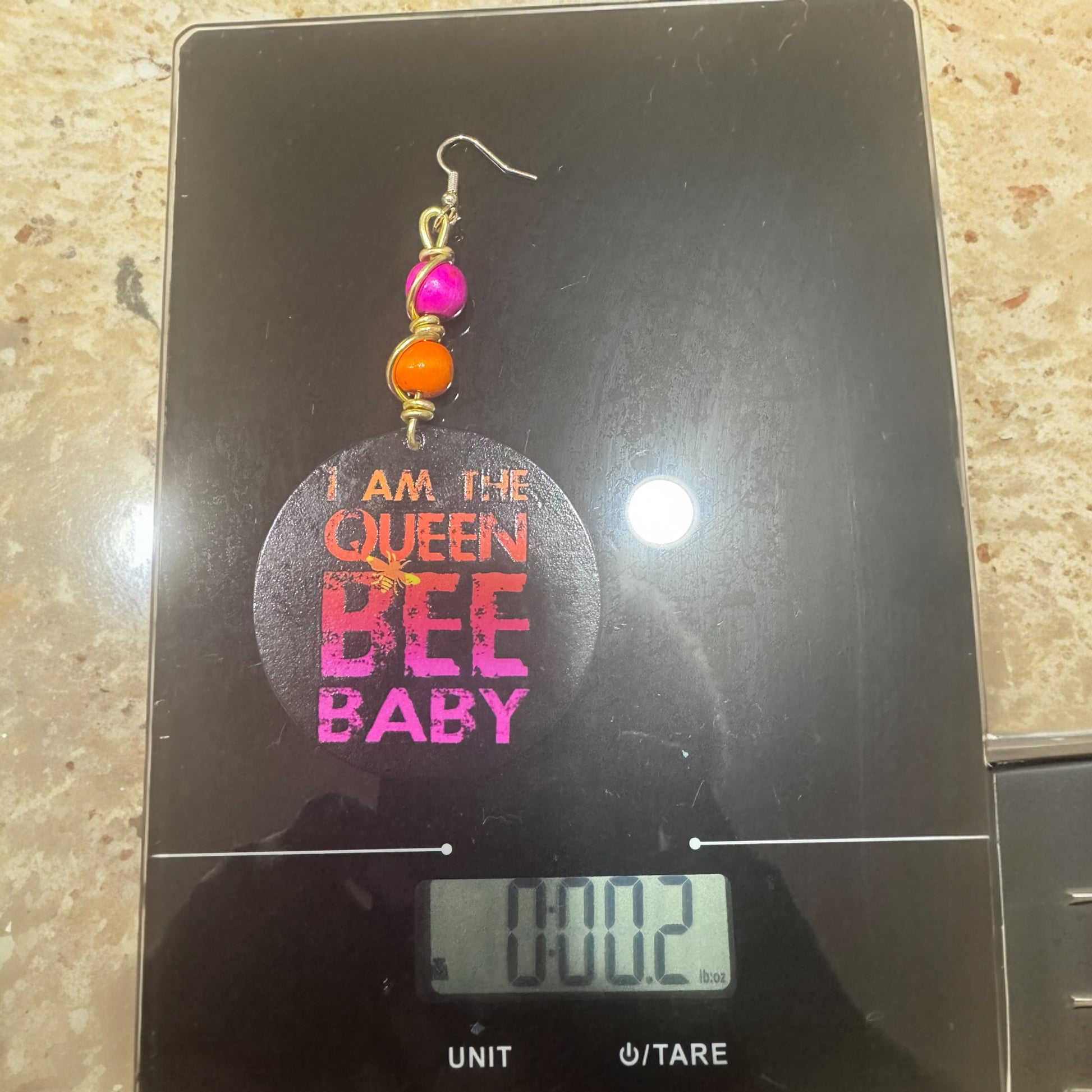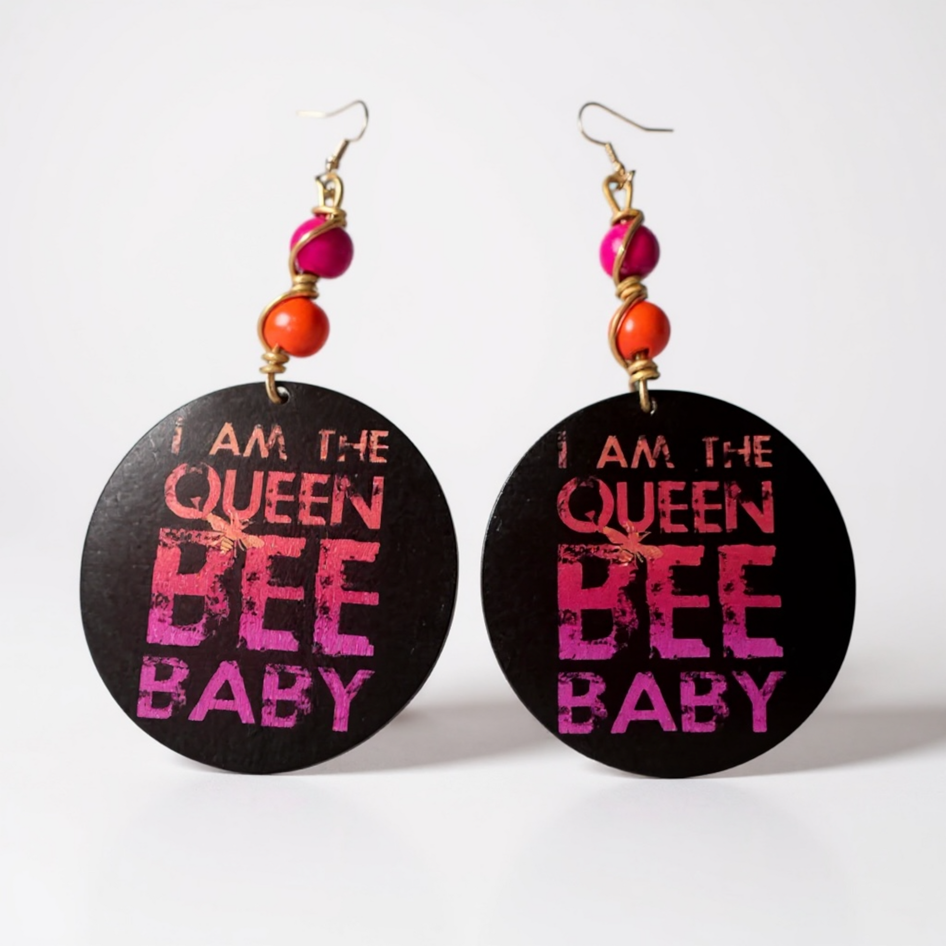 Stand out and exude confidence with our I Am Queen Bee Wood Earrings. Featuring vibrant black, orange, and pink colors with elegant gold accents, these 3.75 inch earrings are the perfect statement piece for any occasion. Made with care and weighing only 0.2 ounces, our limited supply won't last long. Pair with one of our turban headwraps to complete the look.