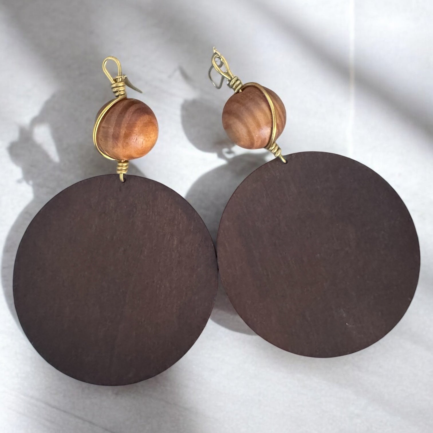 Make a statement with our large round wood brown earrings. Handcrafted with a light brown bead & gold wire, perfect for Juneteenth celebrations & bold looks. Pair with our Dare to be you jewelry & turban head wraps.