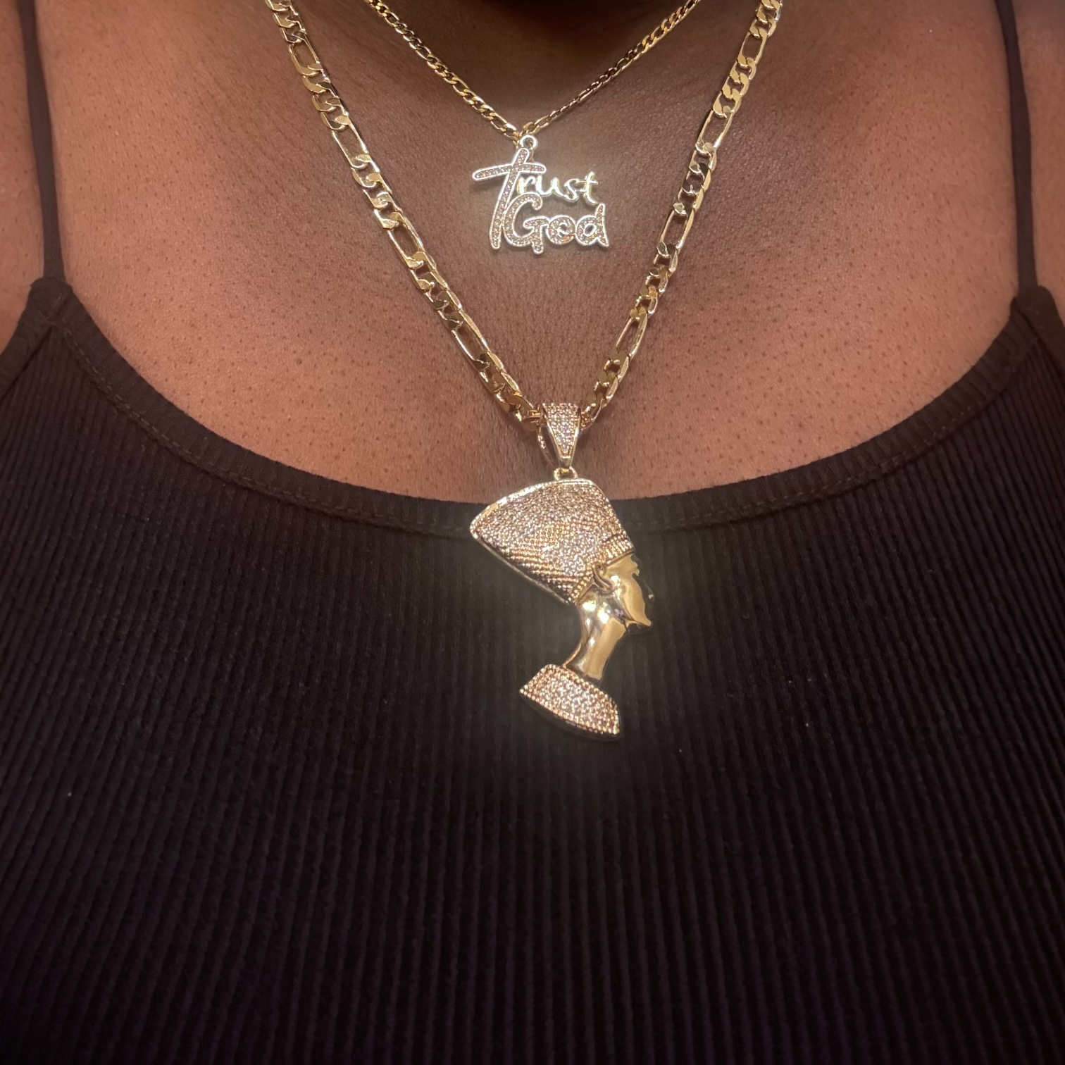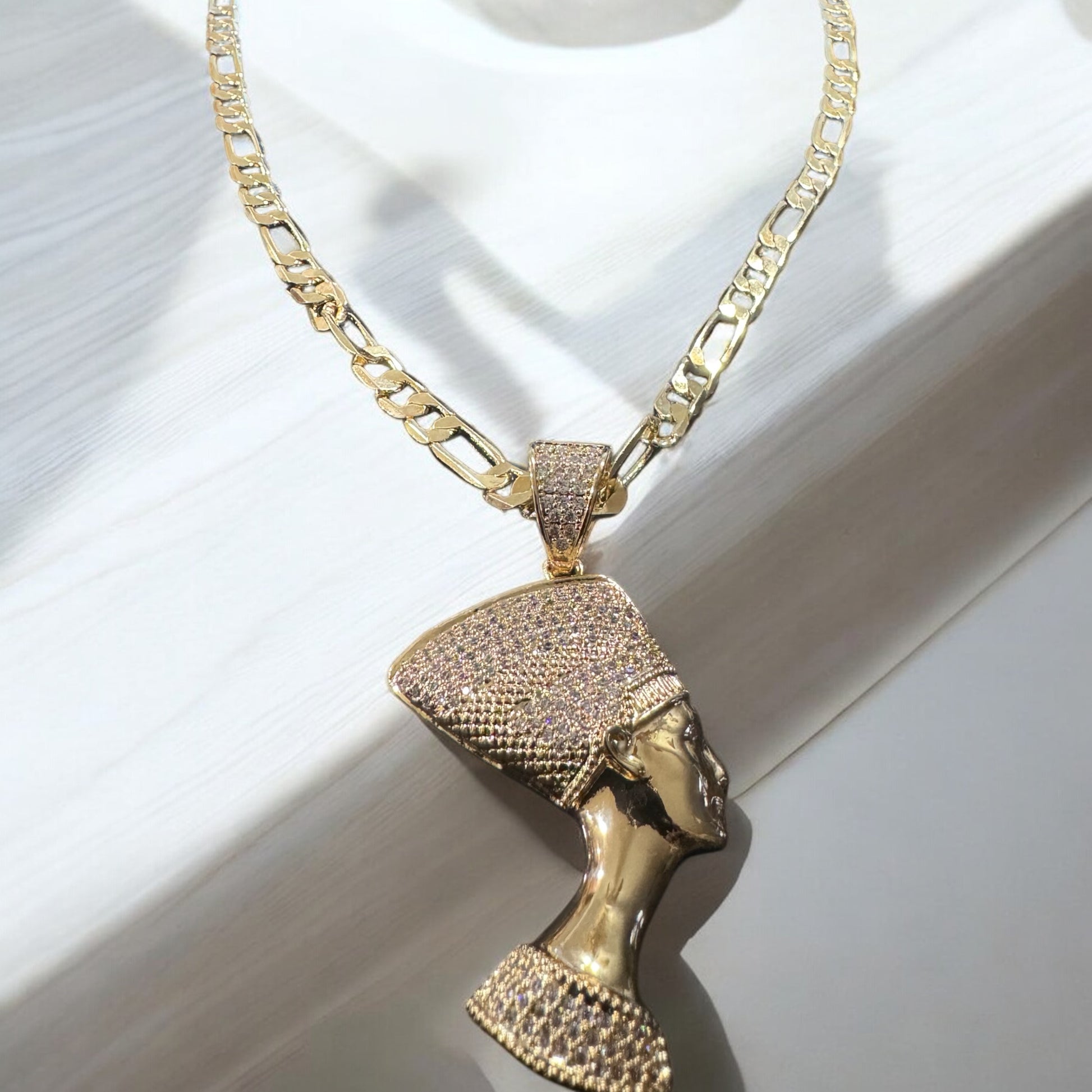 Indulge in pure luxury with our 18k Gold Plated Nefertiti Figaro Chain Necklace. The beautifully crafted pendant shines, exuding elegance and allure with every wear. Elevate your style and exude confidence. Order now! Chain Style: 6.4mm link Figaro Length: 22inches Pendant length: 2.3inches perfect for making a statement.