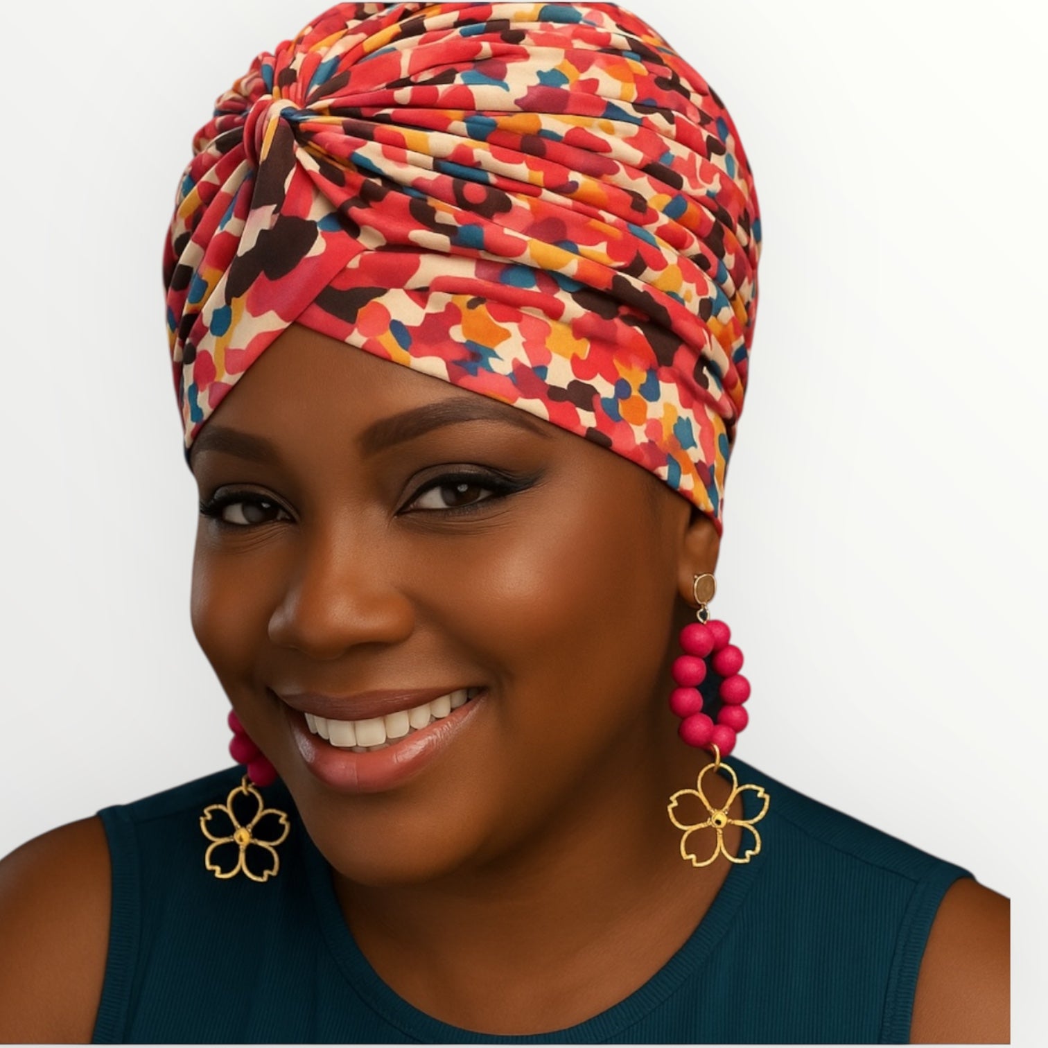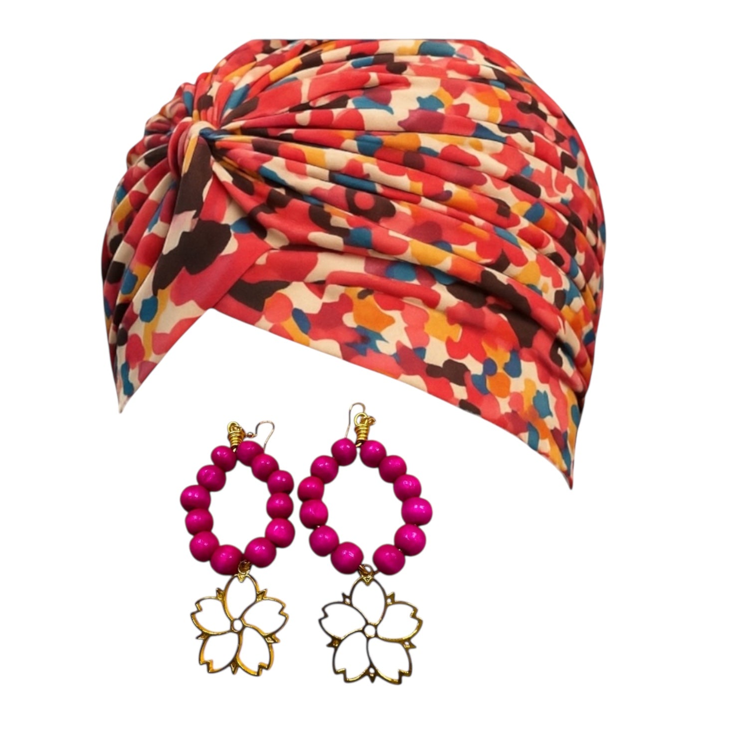 "Add a pop of vibrant color to your summer style with our Pink Flower Printed Turban Earring Set. Made with breathable fabric, this one size fits all headwrap comes with matching pink wood bead earrings featuring a gold color flower charm. Perfect for summer concerts, vacations, and festivals, all for only $20."
