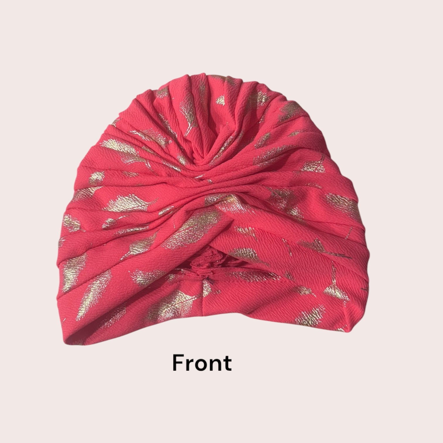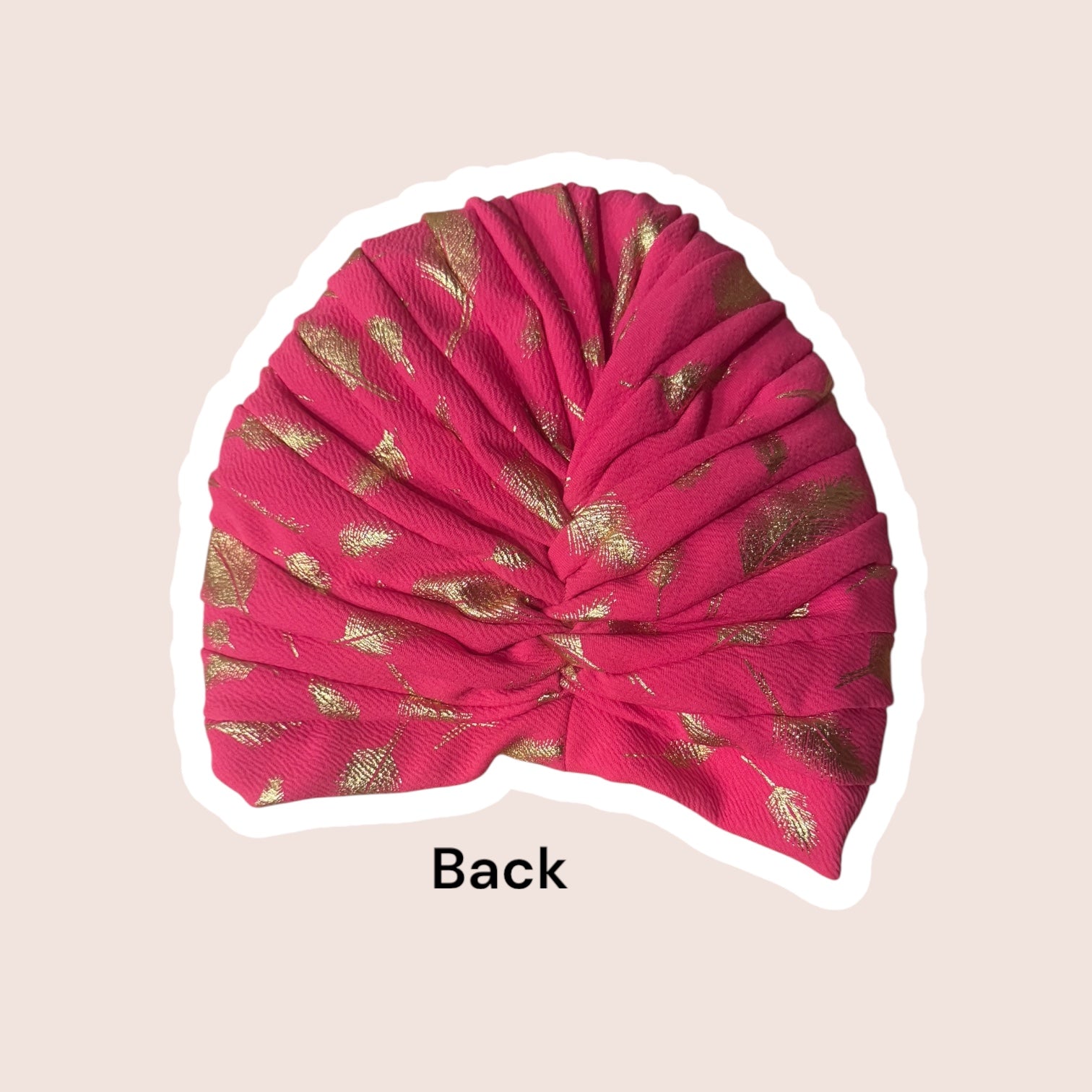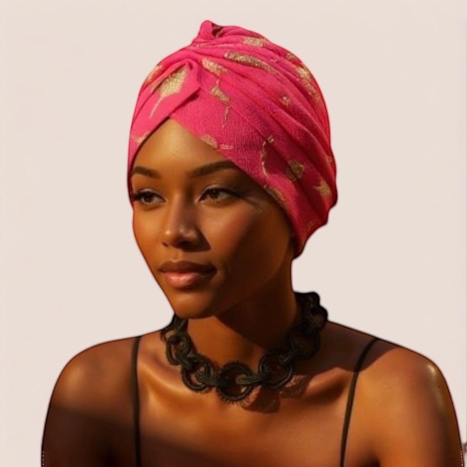 This Pink Turban Head Wrap is the perfect versatile accessory for any occasion. With stretchy fabric and a one-size-fits-all design, you can easily wear it to church or on a night out. The gold flower accents add a touch of elegance to any outfit. Upgrade your style with this beautiful and functional head wrap.