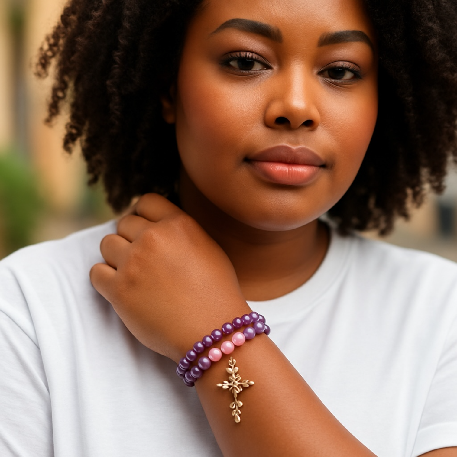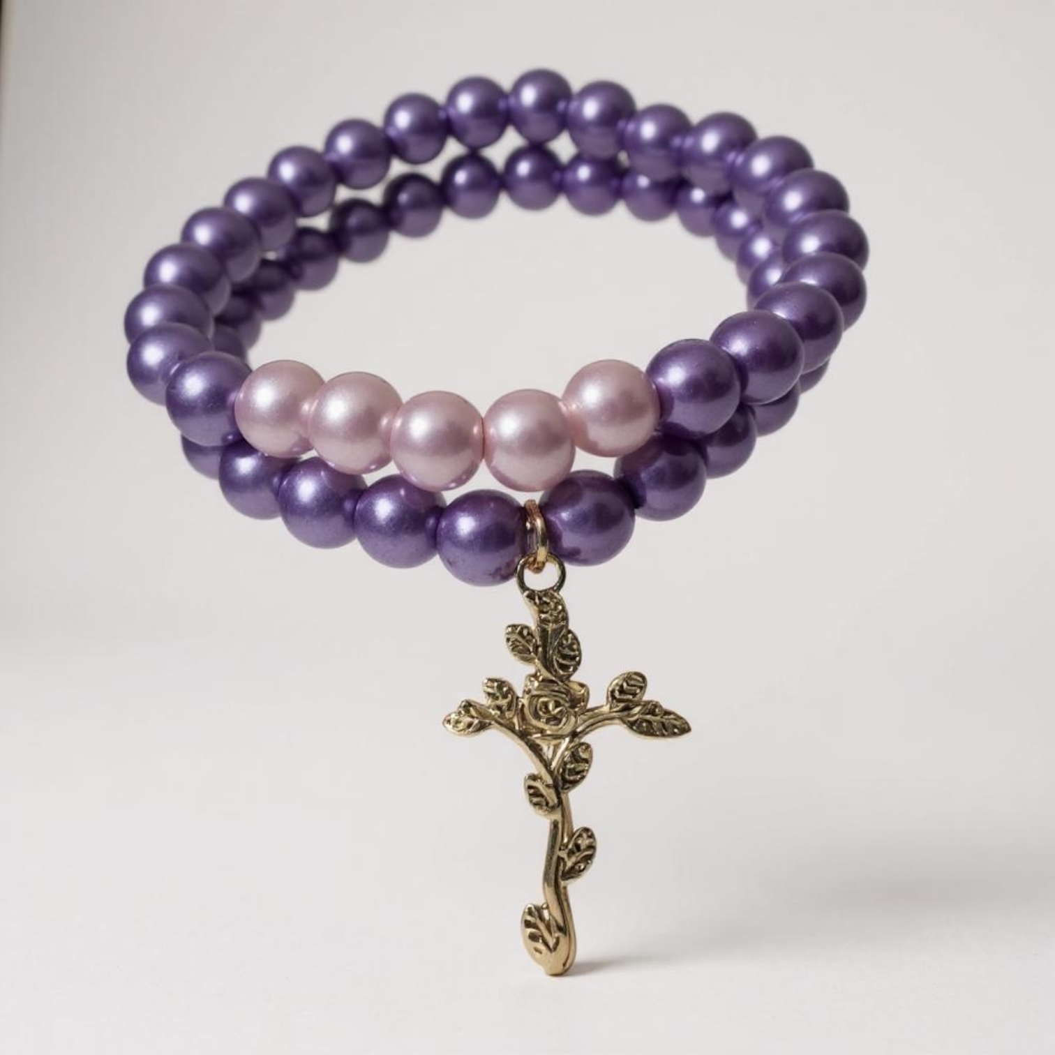 This Purple Glass Bead Cross Bracelet is a beautiful addition to any jewelry collection. The vibrant purple beads and stainless steel charm create an eye-catching design, while the elastic one size fits all feature ensures a comfortable fit. The religious cross with flower print adds a touch of elegance and faith. Perfect for any occasion, this bracelet is a must-have for fashion and spirituality lovers alike.