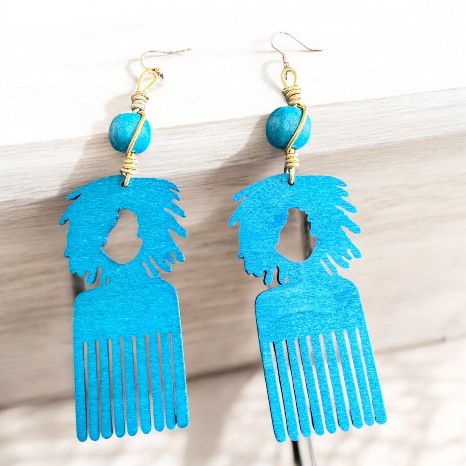 Celebrate your love for the Afro and culture with our Afro Pick Turquoise Wood Earrings. These earrings are perfect for spring and summer events like Summerfest, summer concerts, family gatherings, and Juneteenth. Complete the look with our Dare To Be You turbans and head wraps.