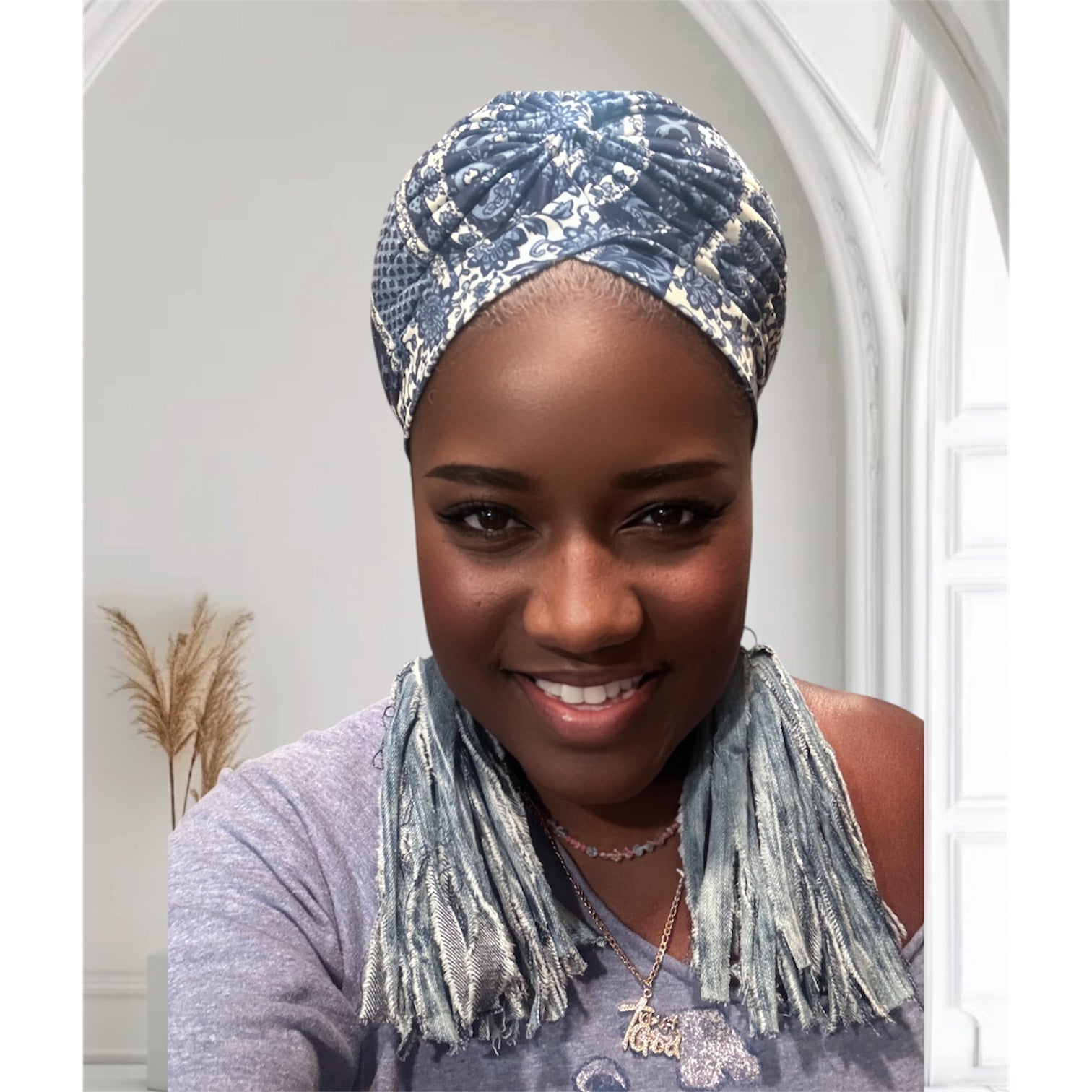 Unleash your unique style with our Ethnic Blue Twisted Turban! Made with breathable and stretchy polyester cotton, it's perfect for any head size. Put the finishing touches on your look with our trendy dare to be you distressed jeans tassel earrings from Cynthia's Handmade Jewelry Collection. Ethnic Pre Twisted Blue Turban Headwrap only $6